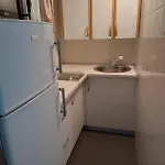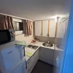 Eine voll ausgestattete Küchenzeile mit einem Wasserkocher, einem Kühlschrank und Küchenutensilien gehört zur Ausstattung der Unterkunft für Selbstversorger.